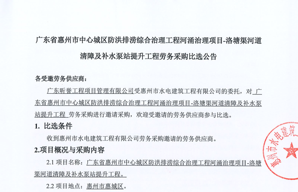 惠州市增江龍門段治理工程施工(一標段)勞務采購中選候選人公示……